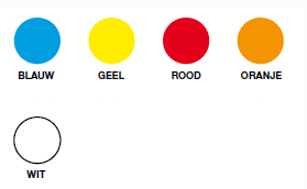 Kleuren: Blauw, Geel, Rood, Oranje, Wit